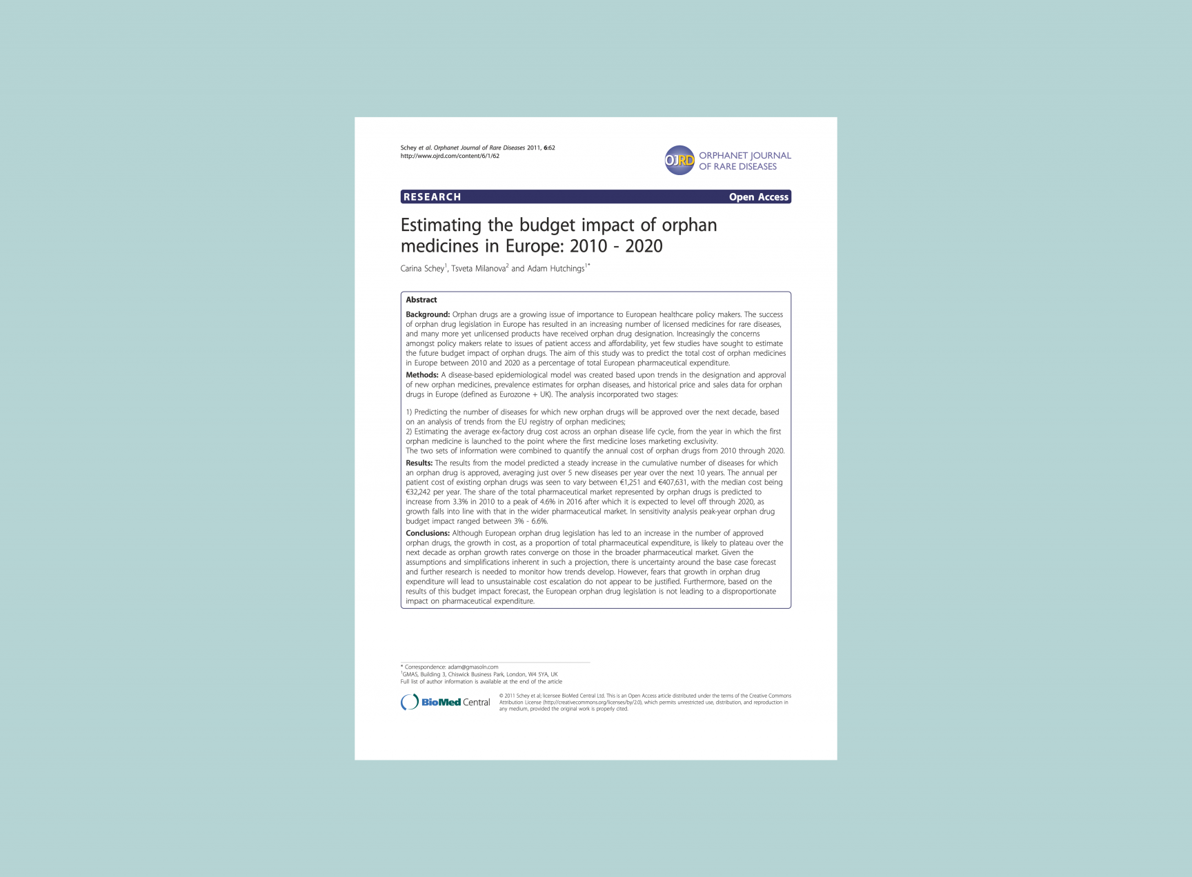 Results: The results from the model predicted a steady increase in the cumulative number of diseases for which an orphan drug is approved, averaging just over 5 new diseases per year over the next 10 years. The annual per patient cost of existing orphan drugs was seen to vary between €1,251 and €407,631, with the median cost being €32,242 per year. The share of the total pharmaceutical market represented by orphan drugs is predicted to increase from 3.3% in 2010 to a peak of 4.6% in 2016 after which it is expected to level off through 2020, as growth falls into line with that in the wider pharmaceutical market. In sensitivity analysis peak-year orphan drug budget impact ranged between 3% – 6.6%.
