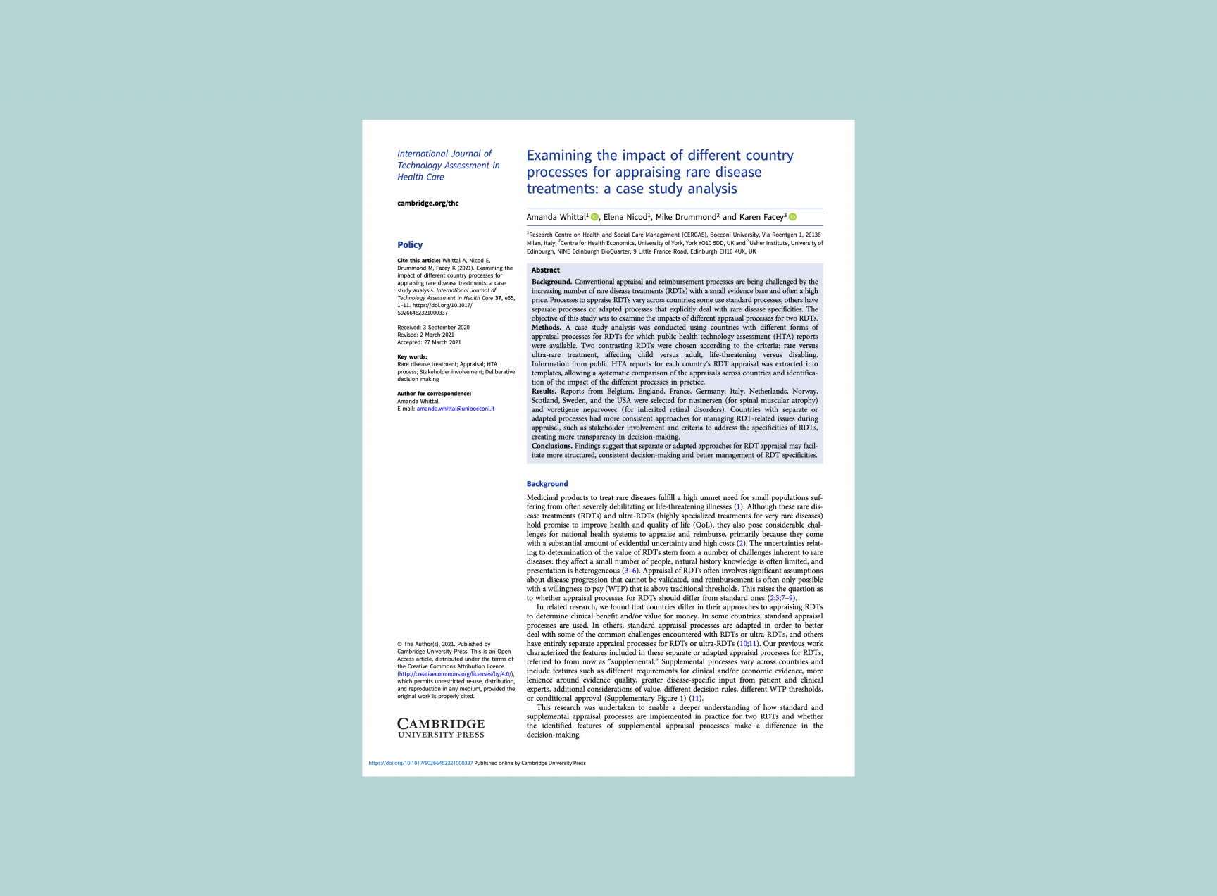 Methods: A case study analysis was conducted using countries with different forms of appraisal processes for RDTs for which public health technology assessment (HTA) reports were available. Two contrasting RDTs were chosen according to the criteria: rare versus ultra-rare treatment, affecting child versus adult, life-threatening versus disabling. Information from public HTA reports for each country’s RDT appraisal was extracted into templates, allowing a systematic comparison of the appraisals across countries and identification of the impact of the different processes in practice.