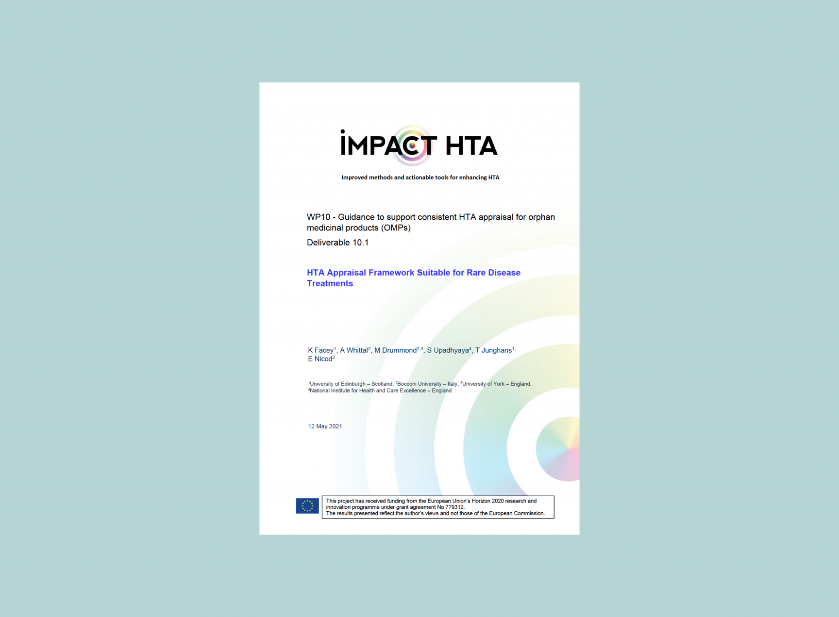 Rare DiseasesValue/HTA12/05/2021 HTA appraisal framework suitable for rare disease treatments Read More Share article:LinkedInEmailCopy Link — Facey K, Whittal A, Drummond M, Upadhyaya S, Junghans T, Nicod E. Impact HTA. 2021. Related articles Why orphan medicines remain out of reach in low- and middle-income countries – and what can be done Rare Diseases27/02/2026 Rare disease policy in high-income countries: An overview of achievements, challenges, and solutions European PolicyRare DiseasesUS Policy10/05/2025 What do the new Medicare negotiations mean for pipeline orphan therapies? Rare DiseasesUS Policy04/03/2025 Rare Disease Day 2025: How might JCA impact orphan sustainability in Europe? JCARare Diseases28/02/2025