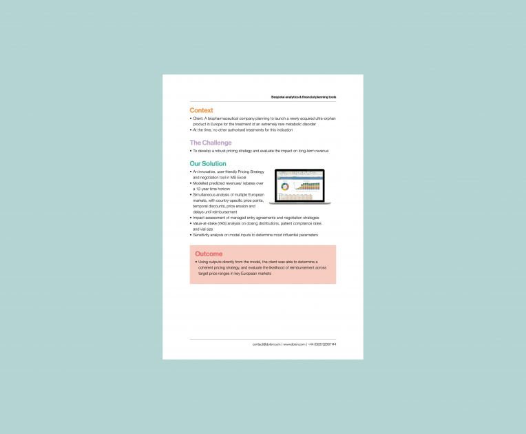 Pricing Ultra-orphan drug pricing strategy Download Case Study Share article:LinkedInEmailCopy Link Related case studies Bespoke analytics & financial planning tools Data & AnalyticsPricing