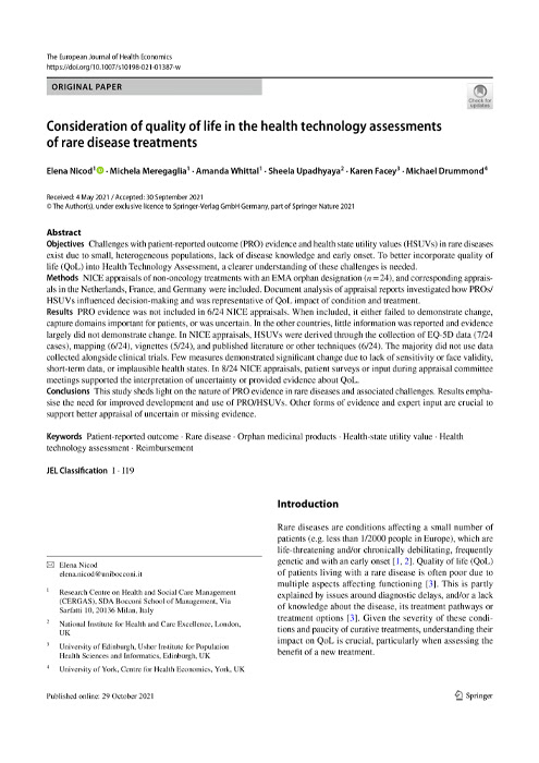 Consideration of quality of life in the health technology assessments of rare disease treatments. The European Journal of Health Economics. 2021 Oct 29:1-25.
